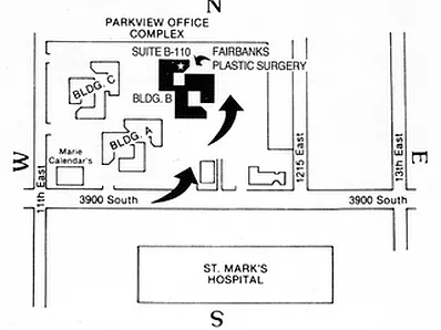 Fairbanks Plastic Surgery Center is located at 1151 East 3900 South across the street, to the North, from the St. Mark’s Hospital. We are in the Parkview Office Complex in the North-center building. If you are coming from the Salt Lake International Airport, follow these directions to reach our office: