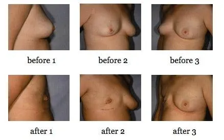 In these pictures we see the cancerous, or otherwise diseased breast in its pre-operative state in the top pictures, and in its post-operative state in the bottom row. The breast glandular tissue has been removed, but the nipple remains.