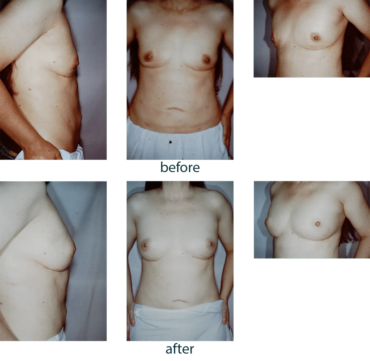 In these pictures, you see the post-operative views in the first row as the result of a nipple sparing mastectomy. Breast reconstruction has been performed on the right side in the second row.
